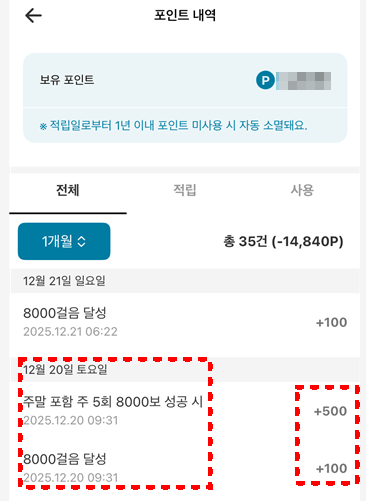 아래 예시처럼 하루 8천보를 달성하면 포인트가 자동 적립됩니다.
